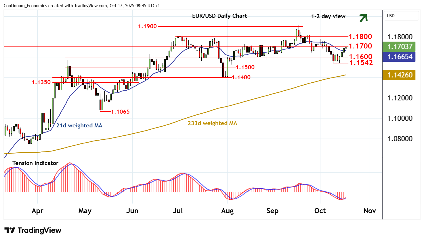 08:35 BST - Cautious trade has given way to fresh tests higher, with prices reaching 1.1725~ before settling back into consolidation around congestion resistance at 1.1700. Intraday studies are mixed/negative, suggesting potential for a test lower. But rising daily stochastics and the improving daily Tension Indicator are expected to limit any losses in renewed buying interest above congestion support at 1.1600. In the coming sessions, fresh gains are looked for. A break back above 1.1700 will open up congestion resistance around 1.1800. But mixed weekly charts are expected to limit any initial tests in consolidation.