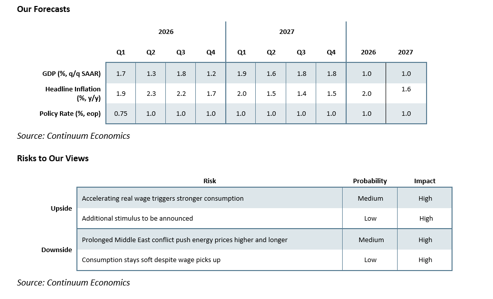 • Private consumption is supported by real wage turning positive in 2026. The trend is solidified by early spring wage negotiation results, which major firms agree to hike stronger than 2025 levels. We revised 2026/27 GDP to +1% as wage gains likely to accelerate. We expect 2026 CPI to be slightly higher at 2% due to oil volatility with the Iran war, before treading lower to 1.6% in 2027 – our baseline is a 4-6 week war, with energy prices coming back down over 3-4 quarters.