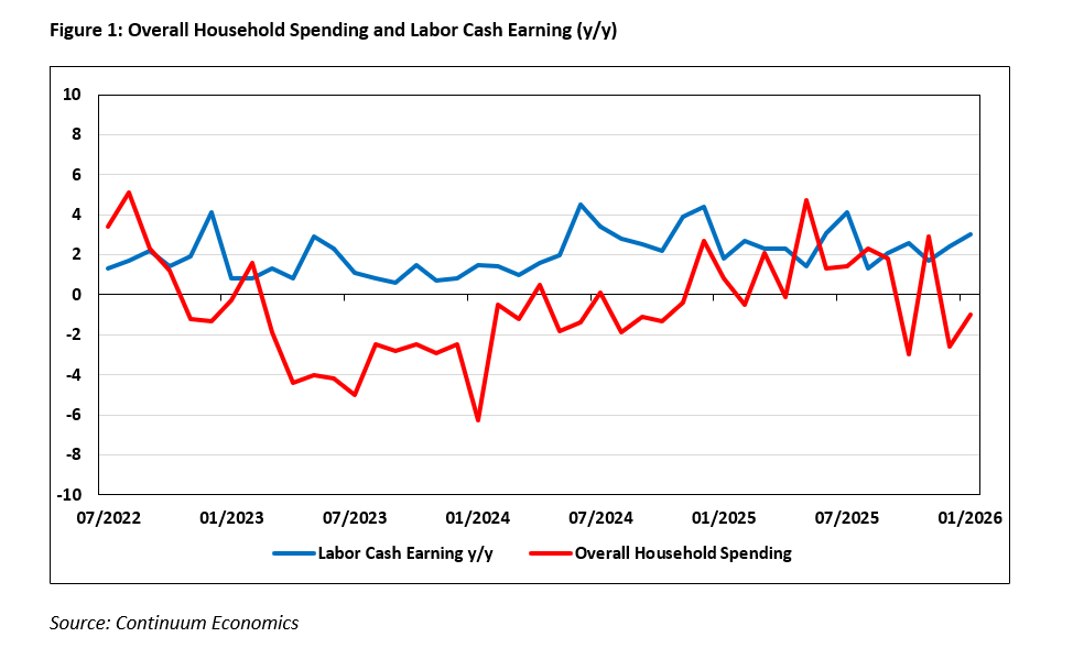 Our forecast for 2026/27 GDP is revised to +1.0% as wage/price setting and consumption behavior are firmly in motion with private consumption the cornerstone. The "Takaichi stimulus" has been partially neutralized by high energy prices and will be contributing less towards previously anticipated economic growth. The 2026 preliminary "Shunto" results have passed even the most optimistic expectation. Major firms (including Nissan and Mitsubishi Motors) have fully accepted union demands, with average hikes landing between 5.5% and 5.9%. In the BoJ’s eyes, these consecutive years of 5%+ hikes confirms that the structural change in wage-setting is now a permanent feature of the Japanese macro-landscape, anchoring inflation sustainably toward the 2% target. With average household spending in 2025 at +1.5% y/y, we are forecasting solid consumption growth in 2026 when real wage accelerates.