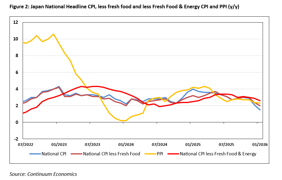 PM Takaichi’s JPY 21.3 trillion stimulus is fully in motion. One-time measures, including the energy subsidies (JPY 7,000/household) and rice coupons, are currently active in Q1 2026. The measures have been extended throughout Q2 to offset the living cost pressure from high global oil prices. The 10-year strategic fund for A.I. and chips has also been officially integrated into the FY2026 budget, reinforcing Japan’s long-term industrial competitiveness and hoping to attract more business investment. Takaichi's fiscal policy remains pro-spending but so far seems disciplined. Our projection of a 0.9% increase in government spending for 2026 sees Takaichi balancing strategic investment & cost relief with the need to secure market confidence.