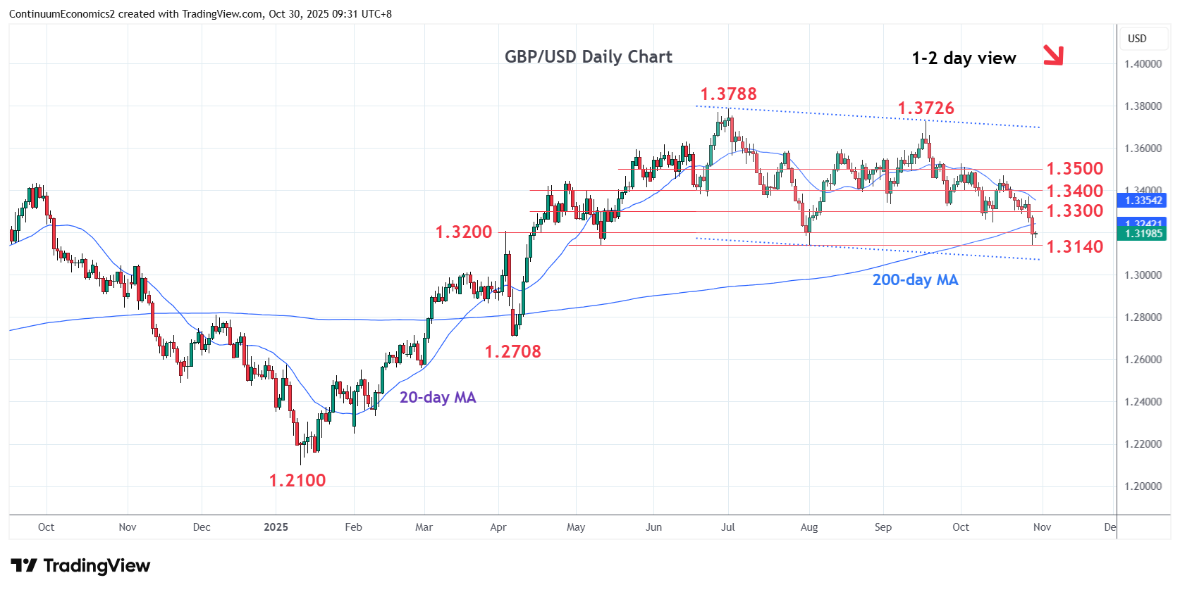 01:40 GMT - Break of the 1.3248 support has seen sharp losses to retest the May/August lows at 1.3140 before turning up to consolidate at the 1.3200 level as prices unwind oversold intraday studies. Daily studies are stretched as well and caution corrective bounce to retrace losses from the 1.3726, September high. Meanwhile, resistance is lowered to the 1.3248 low of 14 October and extending to the 1.3300 congestion. Regaining this needed to fade the downside pressure and open up room for stronger bounce. Break of 1.3140 support will see room to 1.3050/1.3000 congestion.