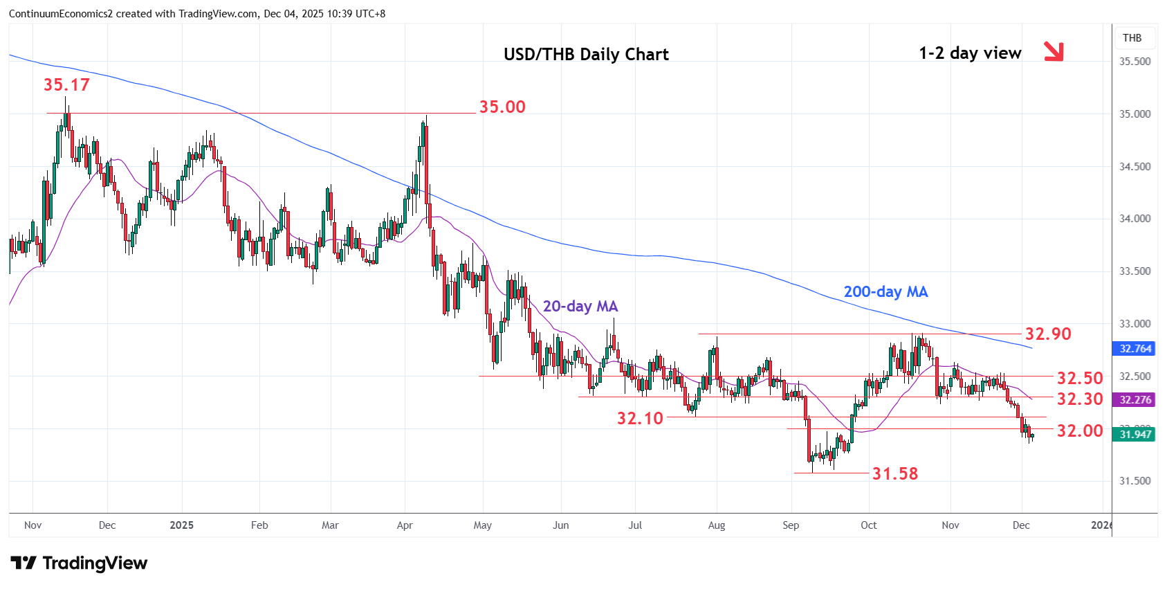 02:45 GMT - Consolidating at the 31.85 low as prices unwind oversold intraday studies. However, pressure remains on the downside and consolidation is expected to give way to selling pressure later. Lower will see room to 31.76 support then the 31.58, September current year low. Below these will extend the broader losses from the 2022 year high and see room to 31.30 and the 31.00 figure. Meanwhile, resistance is at the 32.10, July low. Regaining this, if seen, will see room for stronger bounce to resistance at the 32.23/32.30 area which is expected to cap.