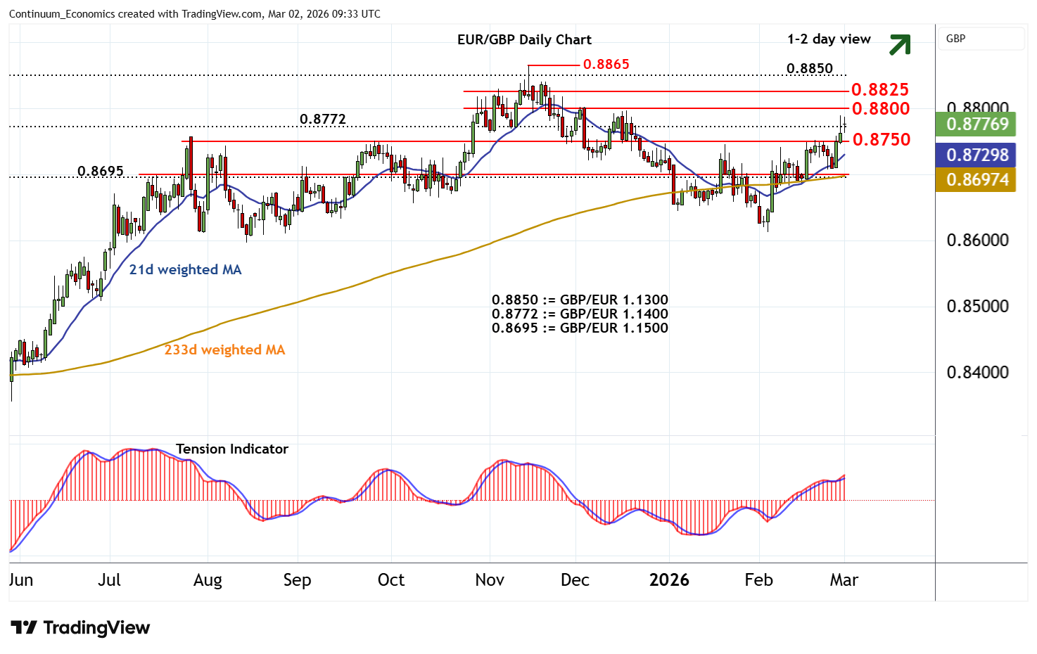 Anticipated gains have reached 0.8790, where mixed intraday studies are prompting short-term reactions