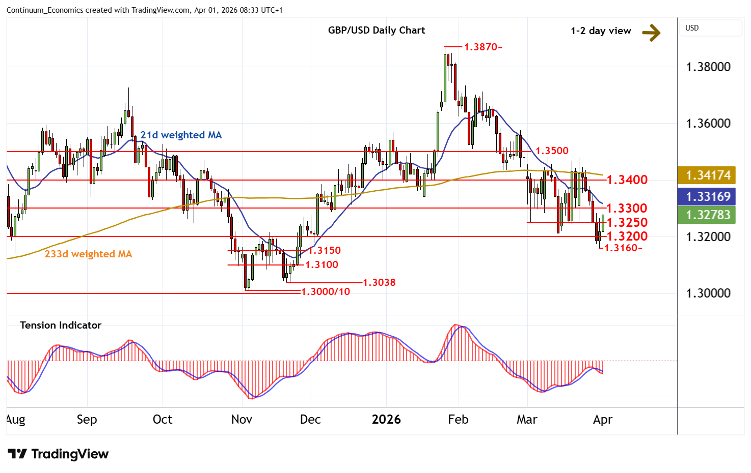 08:10 BST - Choppy trade around 1.3200 has given way to short-covering and a sharp bounce, with focus turning to congestion resistance at 1.3300. Intraday studies are rising and negative daily readings are flattening, suggesting room for a break above here. But mixed/negative weekly charts should limit initial scope in consolidation beneath further congestion around 1.3400. Meanwhile, support is raised to congestion around 1.3250 and extends to 1.3200. But a close below the 1.3160~ current year low of 31 March is needed to turn sentiment negative and confirm continuation of late-January losses, initially into congestion within the 1.3100/50 range.