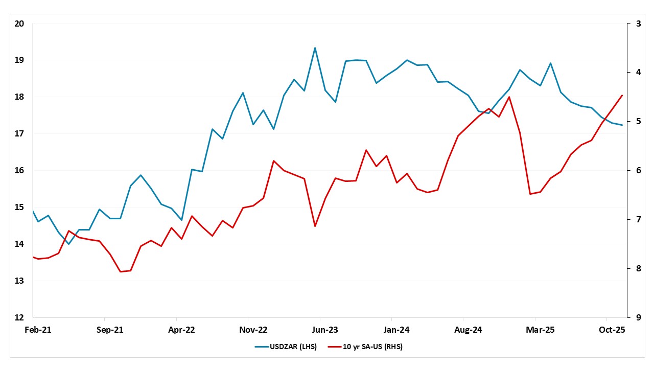 Turning to South Africa, despite SARB continued its cutting cycle in H2, stronger ZAR, and few power cuts in H2, we foresee cautious and data-dependent SARB will likely try to bring inflation down to new 3% anchor. This will mean SARB goes on hold and assess the impact of earlier cuts before continuing its easing cycle in 2026, which will match the Fed pause. Even so, we forecast inflation is set to move closer to 4% in H1, which could pressurize ZAR. On the ZAR upside, if Trump relents on tariffs, power cuts continue to be managed, and a decline in oil prices in 2026 in line with our forecasts, we are likely to see a more risk positive picture emerging with ZAR in 2026. However, 10yr yield spread are now much narrower (Figure 4) and this will likely slow portfolio inflows and mean a weaker ZAR in 2026. Under current circumstances, our end year USD/ZAR rate prediction stand at 17.4 for 2026, and 17.6 for 2027.