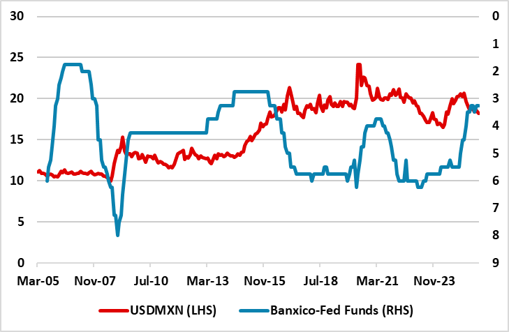 The MXN will be in the spotlight, as President Donald Trump wants to renegotiate USMCA in 2026, which will deepen the trade drama at times in 2026 (here). A renegotiation will be problematic, but we feel that Mexico sees the big picture and will concede to keep most exports going to the U.S., but agreement may not be reached until late 2026 or 2027! This could mean a choppy and weaker MXN in H1 2026. The gap between the Banxico and Fed policy rate is also now getting narrow (Figure 3), which can encourage a correction after 2025 gains. Furthermore, the real effective exchange rate for MXN remains above the 10yr average in contrast to the BRL picture. Finally, the MXN saw little benefit from the major USD downtrend 2002-08. We could push to 19.0 on USDMXN. H2 could see some support for the MXN, as Banxico stops easing and the Fed continues down to 3.00-3.25%. Thus we see a recovery in the MXN in H2 2026, but only to 18.8 on USDMXN. 2027 will likely be better, with the odds of a revised USMCA being delivered by then high and reducing multi-year trade concerns. This can help MXN appreciate to 18.5.