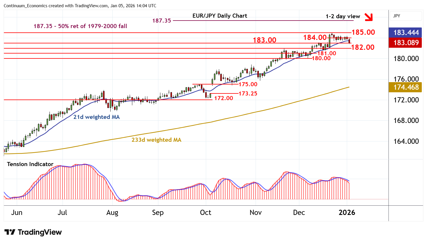 14:00 GMT - Consolidation around congestion resistance at 184.00 has given way to anticipated losses, with prices currently pressuring support at 183.00. Daily readings are bearish and broader weekly charts are turning down, pointing to room for fresh losses. A break below 183.00 will add weight to sentiment and open up support at 182.00. Meanwhile, a close above 184.00 would help to stabilise price action. But a further close above 185.00 is needed to turn sentiment positive and extend long-term gains towards the 187.35 historic Fibonacci retracement and the 187.60 high of August 1990.