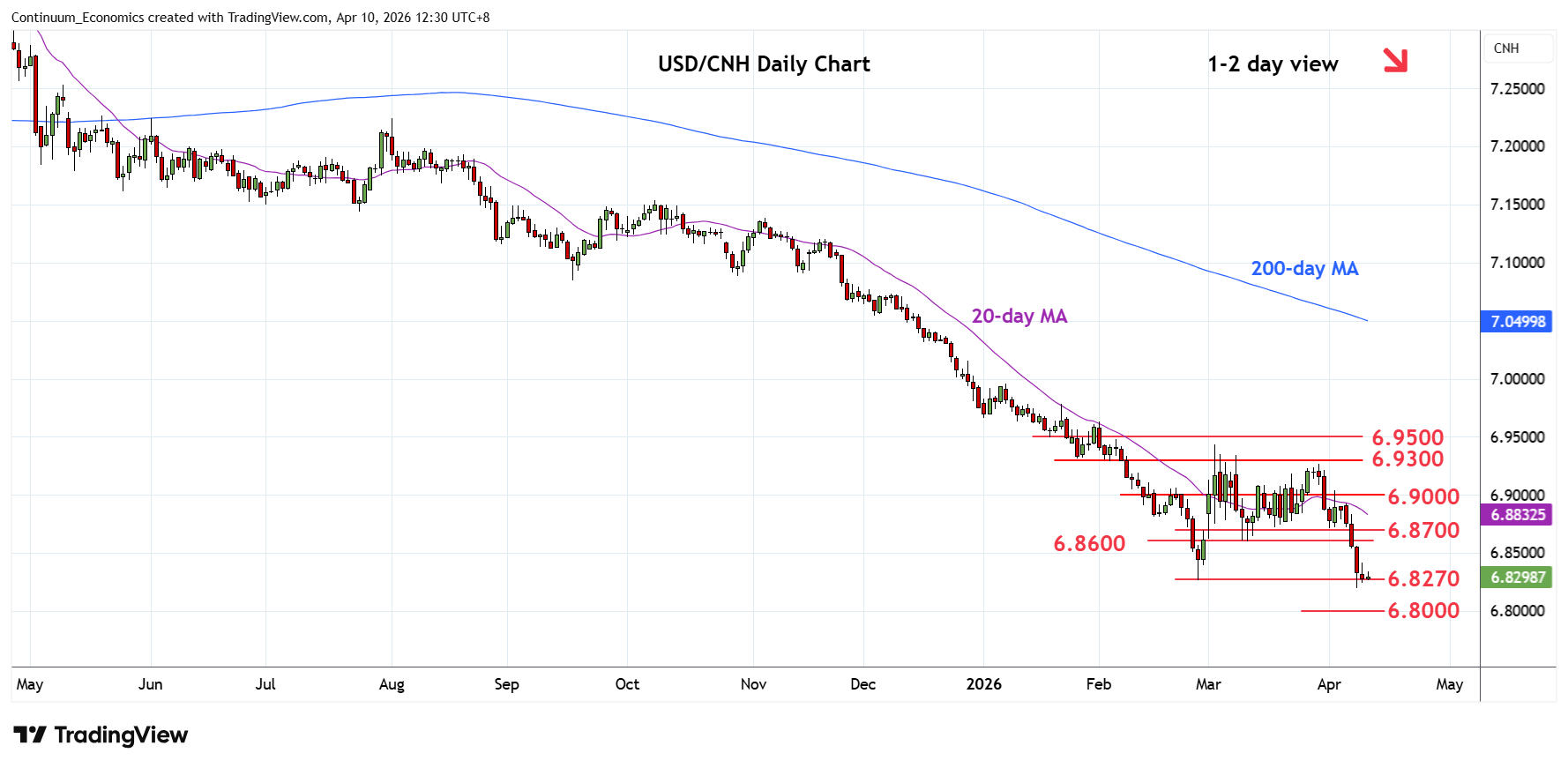 04:35 GMT - Little change, as prices extend consolidation above the 6.8200 fresh year low. Bounce here see prices unwinding oversold intraday studies but negative daily and weekly chart suggest this giving way to further losses later. Lower will see room for extension to the 6.8100 support and 6.8000 figure. Break here will see room to further retrace gains from the 2022 year low to 6.7750 and 6.7500 congestion area. Meanwhile, resistance is lowered to the 6.8600/6.8700, March and 1st April low, which is expected to cap corrective bounce and sustain losses from the 6.9270/6.9340, March swing highs.