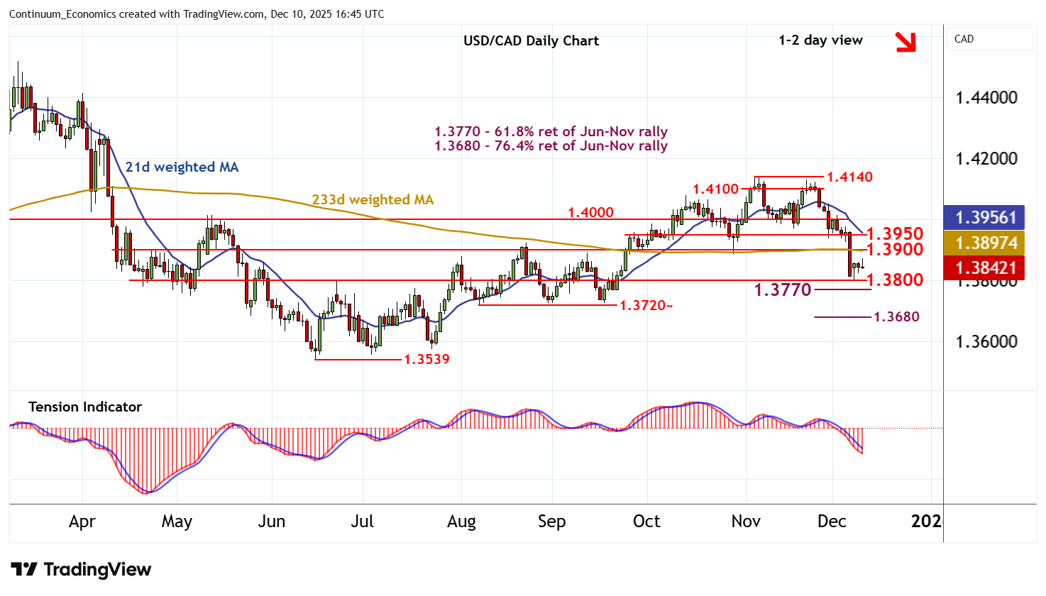 16:35 GMT - Little change, as mixed/negative intraday studies and rising oversold daily stochastics keep near-term sentiment cautious, and extend consolidation around 1.3835. The daily Tension Indicator continues to track lower and broader weekly charts are bearish, highlighting room for further losses in the coming sessions. A later break below congestion support at 1.3800 will open up the 1.3770 Fibonacci retracement, where fresh consolidation could develop, before November losses extend still further. Meanwhile, a close above resistance at the 1.3900 break level, if seen, will help to stabilise price action and prompt consolidation beneath 1.3950.