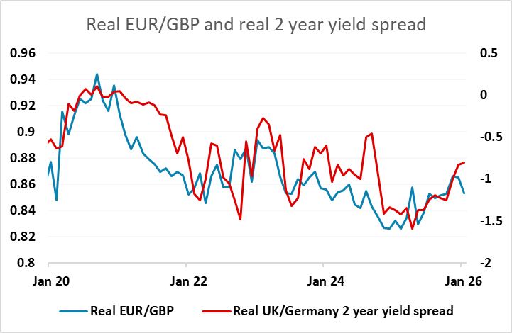 GBP has moved slightly higher following stronger than expected November GDP data, which rose 0.3% m/m against a market consensus of 0.1%. The rise was due to a 0.3% gain in services and a 1.1% gain in industrial output, driven by a 25% increase in car production as JLR plants reopened after a cyberattack. Construction output fell 1.3%, moderating the increase, but the numbers, particularly the services data, suggest the economy is moving along broadly as expected, and will likely douse expectations of any BoE rate cut in the near future. The first cut is currently priced for April (with an 85% probability) and this data will probably not change that significantly. GBP is already somewhat higher than might be expected given current real yield spreads, so the scope for further gains looks quite limited, and we would not expect much progress below 0.8650 in EUR/GBP, but the pound should retain a firm tone through the day.