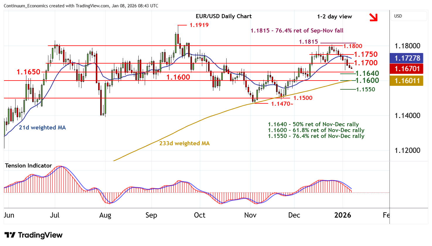 Little change as prices continue to drift lower towards support at congestion around 1.1650 and the 1.1640 retracement