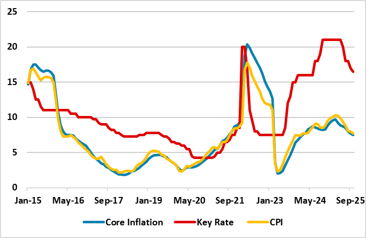 It is worth noting that CBR announced in its midterm outlook that average quarterly inflation will be at the level of 6.8-8.7% annually in Q4, and added annual inflation as of 2025 year-end will evolve at the level of 6.5-7%. Despite CBR predicts annual inflation will decline to 4.0–5.0% in 2026 while underlying inflation is expected to reach 4% in 2026 H2, we think this is very unlikely due to proinflationary risks such as high inflation expectations, the effects of the VAT increase, and a possible deterioration in the terms of external trade.