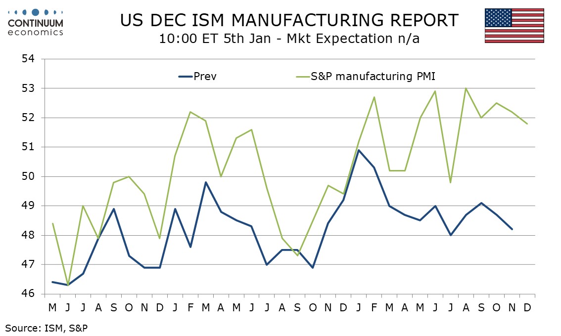 The S and P manufacturing index has been consistently outperforming the ISM’s, and the dip in December’s S and P index follows a weaker Empire State survey in December. However there is still little direction to trend, with the S and P index steady a little above 50 while the ISM is steady a little below. Manufacturing payrolls have seen seven straight modest declines.