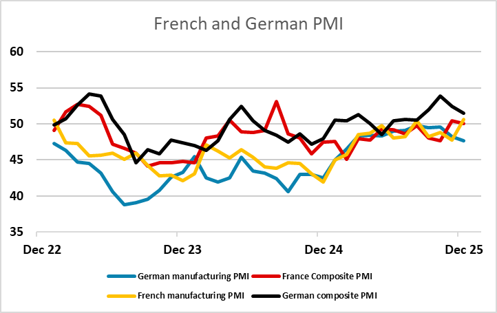Weaker than expected German PMI and slightly weaker than expected French PMI should weigh a little on the EUR, which has benefited recently from a perception of improving growth prospects. The EUR has dipped modestly after the German data having risen a little after the French data. Combined with the weaker tone to equities, this suggests downside risks for EUR/JPY which already looks significantly overstretched.