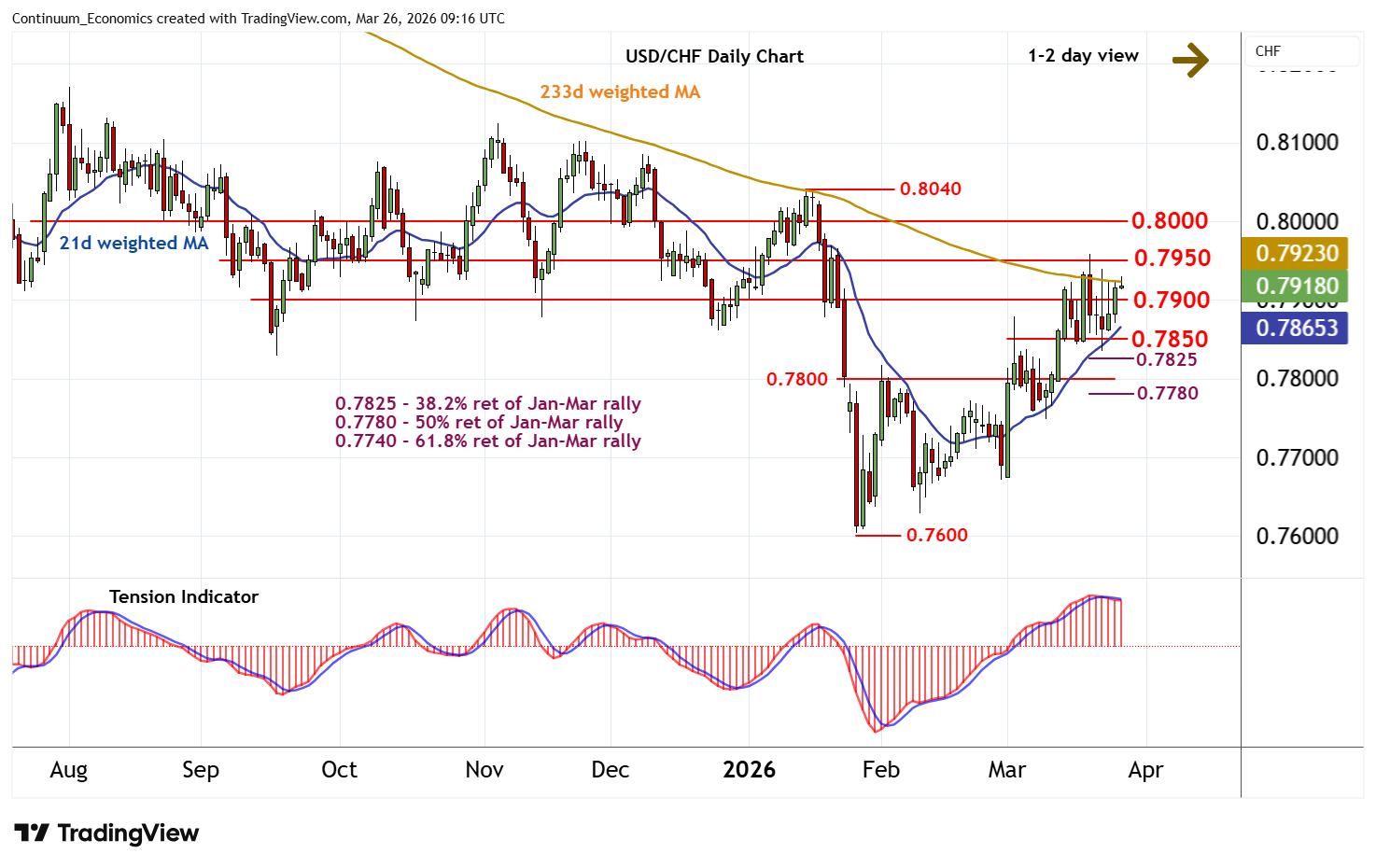 09:10 GMT - Cautious/choppy trade beneath 0.7900 has given way to a push higher, with prices currently balanced in fresh consolidation around 0.7915 as intraday studies turn mixed. Daily stochastics have ticked higher, suggesting room for continuation towards congestion resistance at 0.7950. But the flat daily Tension Indicator should limit any initial tests in consolidation, before rising weekly charts prompt still further gains towards 0.8000. Meanwhile, a close back below 0.7900 will open up strong support at 0.7850, where renewed buying interest is expected to appear.