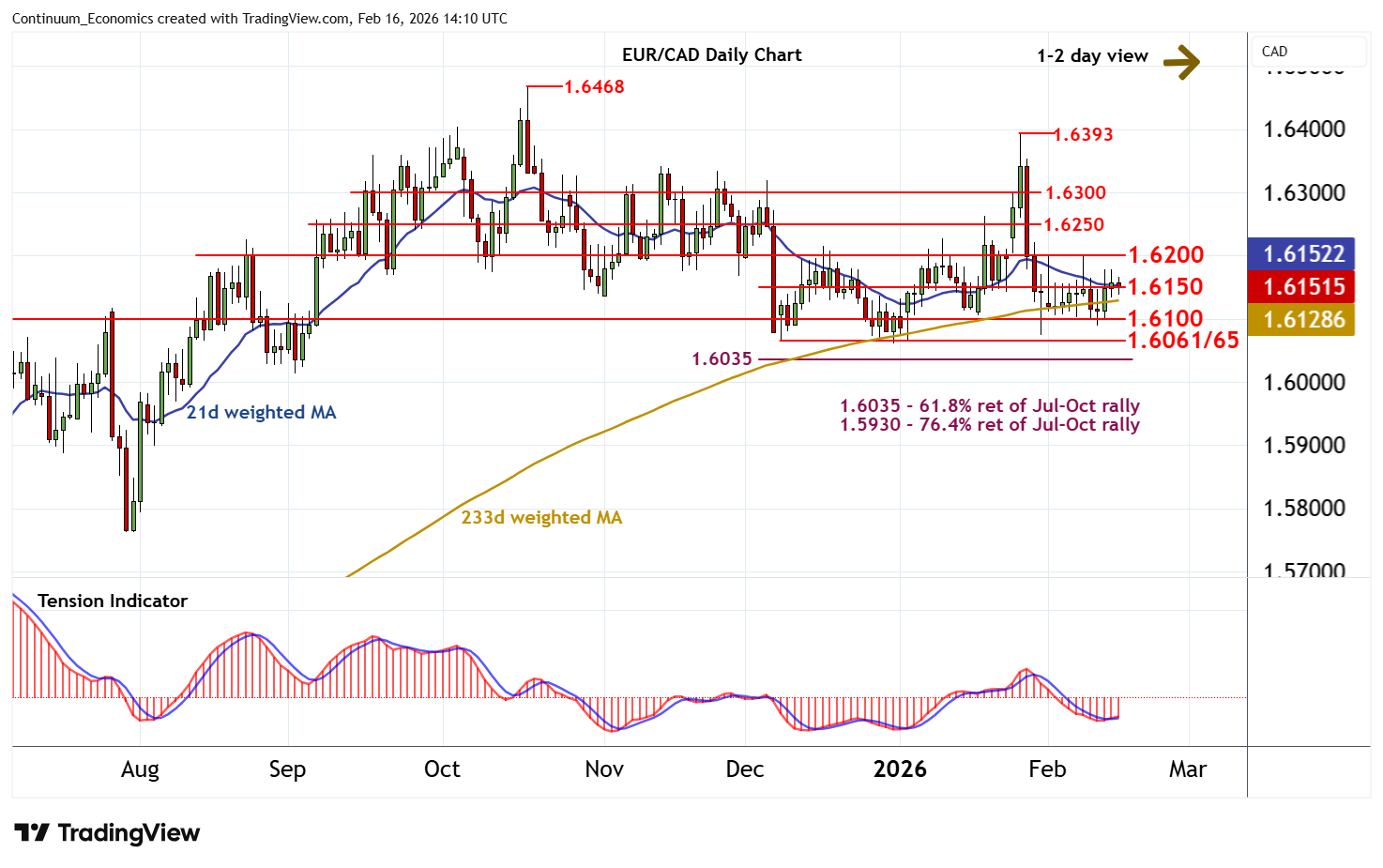 13:55 GMT - Still little change, as prices extend cautious trade around congestion resistance at 1.6150. Intraday studies are under pressure, highlighting room for a drift down to congestion support at 1.6100. But rising daily readings should limit any initial tests in consolidation, before bearish weekly charts extend losses still further. A close below the 1.6061/65 monthly lows from 8-31 December is needed to turn sentiment negative and extend October losses initially to the 1.6035 Fibonacci retracement. Meanwhile, any immediate tests above 1.6150 should be limited in renewed selling interest towards further congestion around 1.6200.