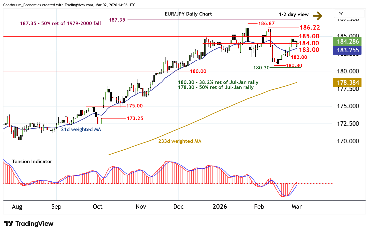 13:55 GMT - The break below 184.00 has bounced smartly from 183.50~, with prices once again trading above congestion support at 184.00. Daily stochastics and the daily Tension Indicator are rising, highlighting room for a test of the 184.75~ weekly high of 25 February. But already overbought daily stochastics and mixed/negative weekly charts should limit any immediate break in renewed selling interest towards 185.00. Meanwhile, support at the 183.00 break level should underpin any immediate tests back below 184.00.