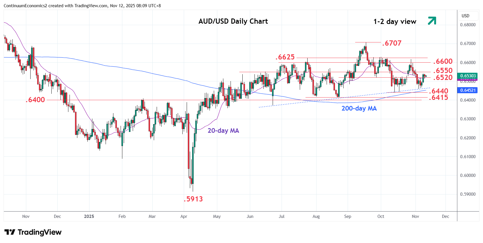 00:10 GMT - Little change, as prices holds a narrow range below Monday's .6540 high. Consolidation here expected to give way to renewed buying interest later with positive daily studies suggesting potential for break here and .6550 congestion to open up room for extension to retest strong resistance at the .6600 level and .6625/30 highs. Meanwhile, support is raised to the .6520/00 area which should underpin and sustain bounce from the .6458 low. Only below the latter will threaten critical support at .6440/.6415, October/August lows.
