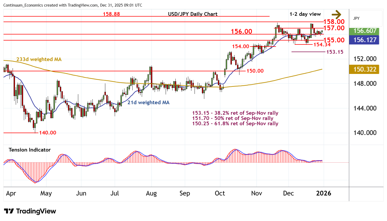 08:50 GMT - Cautious trade above congestion support at 156.00 has given way to a USD-driven bounce, with prices currently trading around 156.60. Rising intraday studies highlight room for a test of congestion resistance at 157.00. But mixed daily readings and bearish weekly charts are expected to limit any break above here in renewed selling interest beneath strong resistance at the 157.90 monthly high of 20 November and the 158.00 break level. Following corrective trade, fresh losses are looked for. A close below 156.00 will add weight to sentiment and open up 155.00. However, a close below the 154.34 weekly low of 5 December is needed to turn sentiment negative and confirm continuation of late-November losses.
