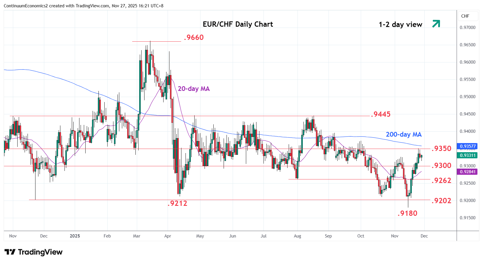 08:30 GMT - Little change, as prices settled back in range from the .9350 resistance to consolidate gains from the .9180 low and unwind overbought daily studies. Weekly readings remain positive and highlight room for further gains later. Higher will see room for extension to resistance at the .9373/.9400 October and congestion area. Meanwhile, support remains at the .9300 congestion which should underpin. Below here will open up room for deeper pullback to the .9262/.9250 August low and congestion area.