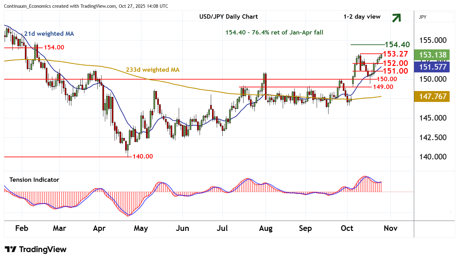 Little change, as negative intraday studies keep near-term sentiment under pressure and extend consolidation beneath strong resistance at the 153.27 current year high of 10 October