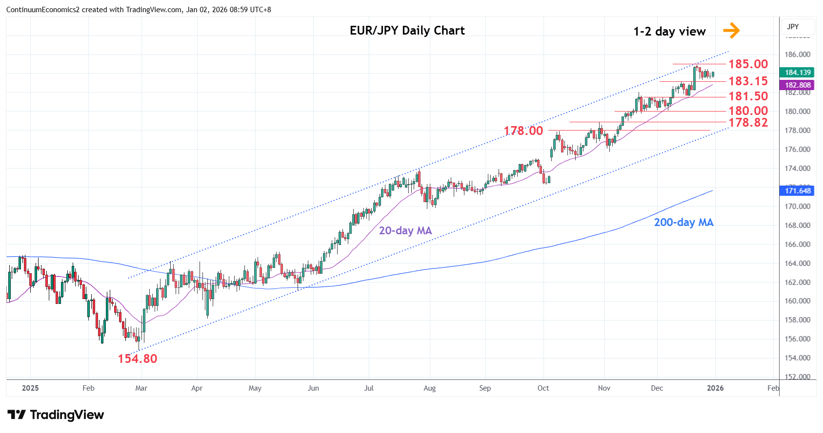 01:00 GMT - Little change, as prices extend consolidation at the 184.00 level following pullback from the 184.92, 2025 year high. Bullish structure from the February 2025 year low suggest consolidation giving way to renewed buying interest later. Higher will see extension to fresh multi-year high to target the 185.00/186.00 congestion area from August 1990. However, deep overbought daily and weekly studies caution corrective pullback. Would take break of support at 183.15 to ease the upside pressure and open up room for deeper pullback to strong support at the 182.00/181.50 area.