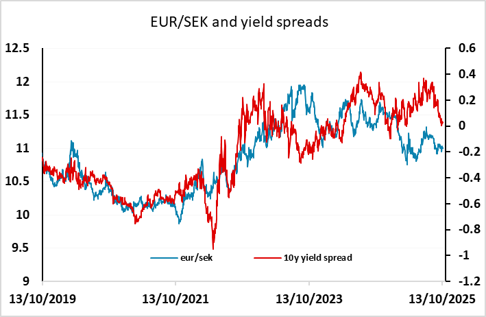 Wednesday’s calendar is once again looking quiet. Swedish final September CPI data could have an impact, as the preliminary data have not been particularly reliable. Risks on any impact are towards the SEK downside, as inflation has been soft and further declines could suggests a need for further easing. As it stands, market pricing only suggests a 20-30% chance of another cut this year, so there is scope for that to increase. EUR/SEK remains a little below the levels suggested by current yield spreads, and NOK/SEK even more so, so we continue to see some downside risks for the SEK.