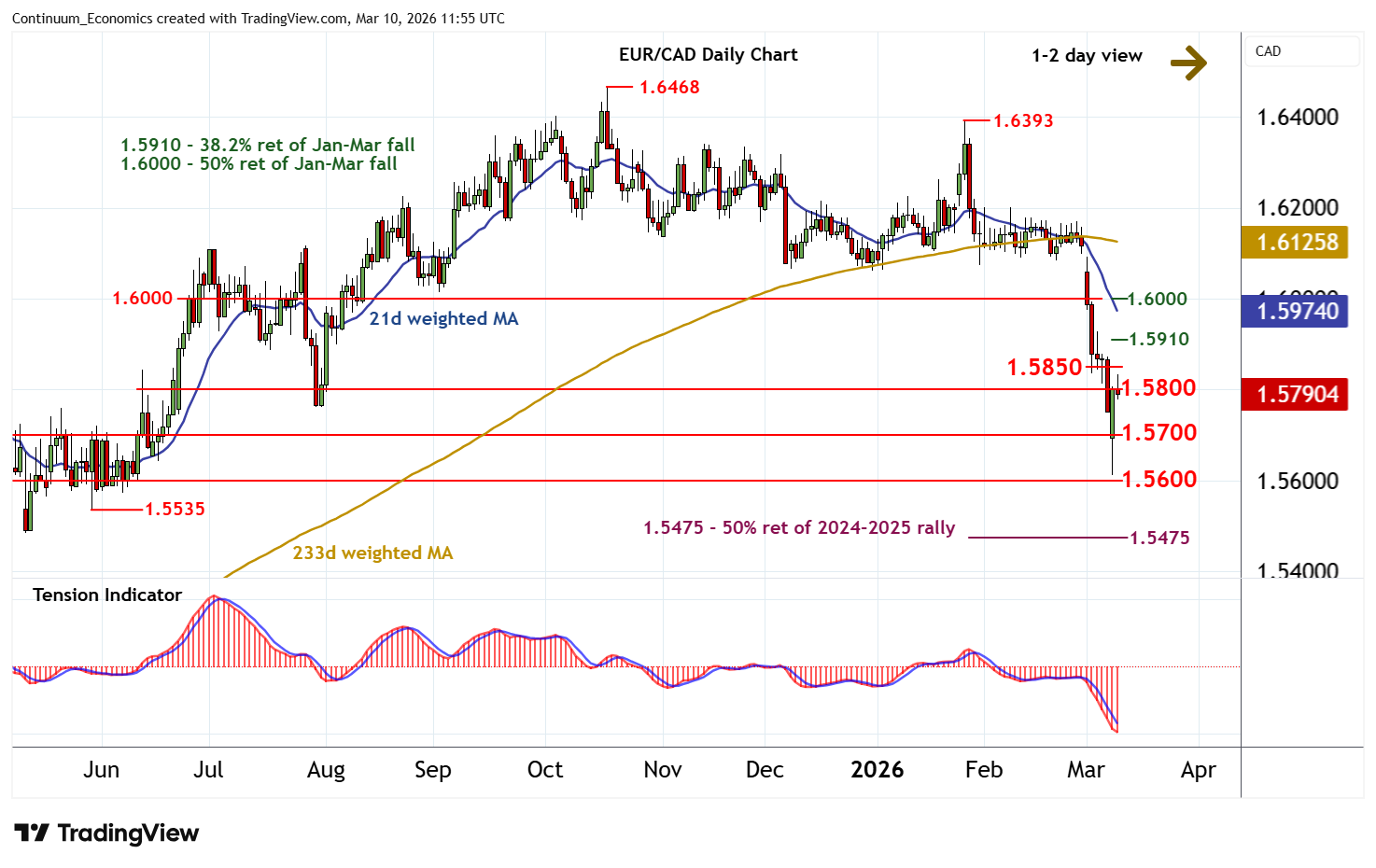 11:30 GMT - Consolidation above support at congestion around 1.5600 and the 1.5615 current year low of 9 March has given way to a steady bounce, with prices currently balanced in consolidation around congestion resistance at 1.5800. Oversold daily stochastics are turning higher, suggesting room for a test above here towards further congestion around 1.5850. But the bearish daily Tension Indicator and mixed/negative weekly charts should limit any further gains in renewed selling interest towards the 1.5910 Fibonacci retracement. Meanwhile, support is raised to congestion around 1.5700 and should underpin any immediate setbacks.