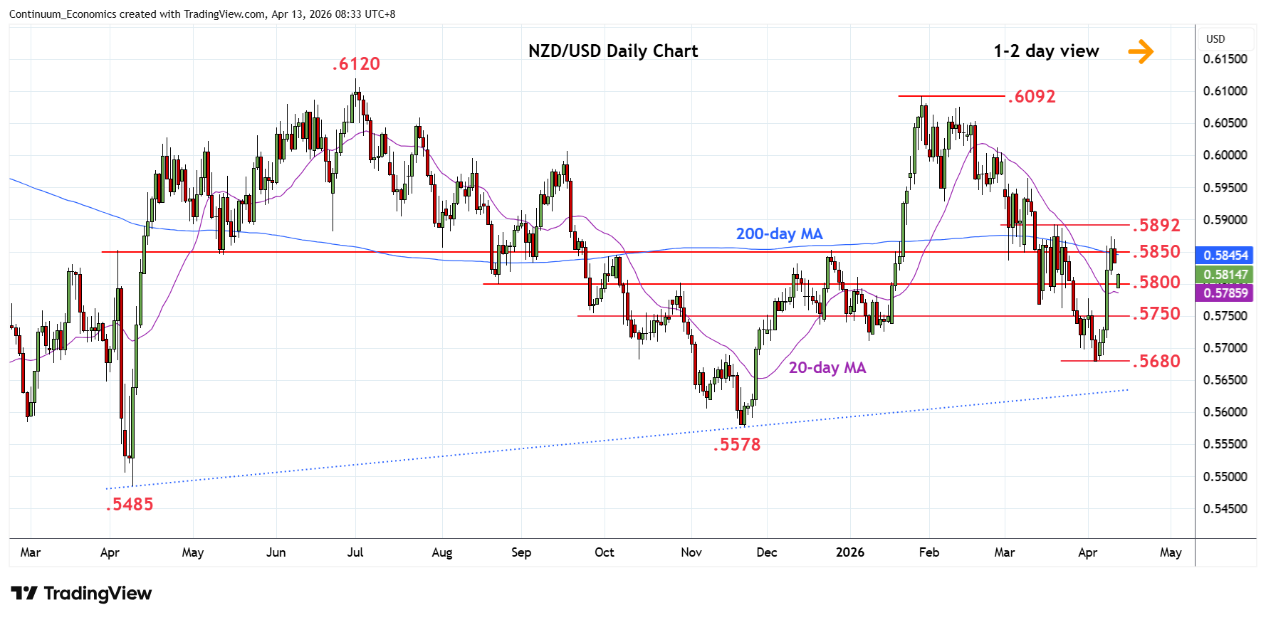 00:30 GMT - Lower opening has seen pullback to .5795 low before turning higher as gap at .5832 low of Friday attracts. However, lower high at the .5892 high of last week threatens deeper pullback to retrace gains from the .5680 current year low. Lower will see room to support at the 5750 congestion. Break here will return focus to the downside and threatens retest of support at the .5700/.5680 congestion and 3 April YTD low. Meanwhile, resistance at the .5850 congestion and .5874 high of last week now expected to cap.