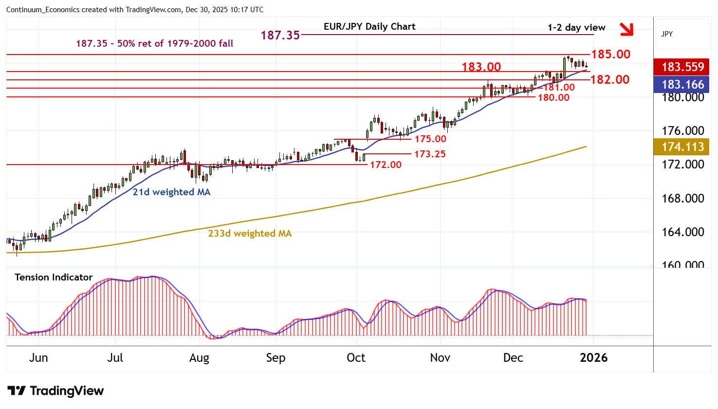 10:10 GMT - Cautious trade around 184.00 is giving way to a drift lower, as intraday studies remain under pressure, with prices currently balanced around 183.50. Daily readings have turned bearish and broader weekly charts are under pressure, pointing to room for still deeper losses. Support is at 183.00. A break beneath here will add weight to sentiment and open up support at 182.00. Meanwhile, a close above 185.00 is needed to turn sentiment positive and extend long-term gains towards the 187.35 historic Fibonacci retracement and the 187.60 high of August 1990.