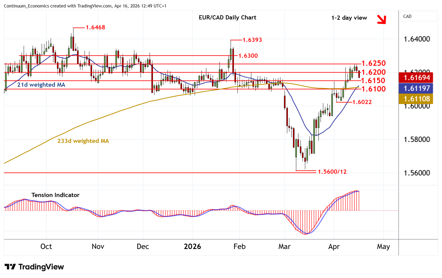 12:20 BST - The test of congestion resistance at 1.6250 has been pushed back, as intraday studies turn down, with prices currently trading around 1.6175. Overbought daily stochastics are unwinding and the daily Tension Indicator is also turning down, highlighting room for further losses in the coming sessions. A break below congestion support at 1.6150 will open up 1.6100. But rising weekly charts should limit any initial tests of here in renewed buying interest/consolidation. Meanwhile, a close back above congestion resistance at 1.6200 would help to stabilise price action. But a further close above 1.6250 is needed to turn sentiment positive and extend early March gains towards further congestion around 1.6300.
