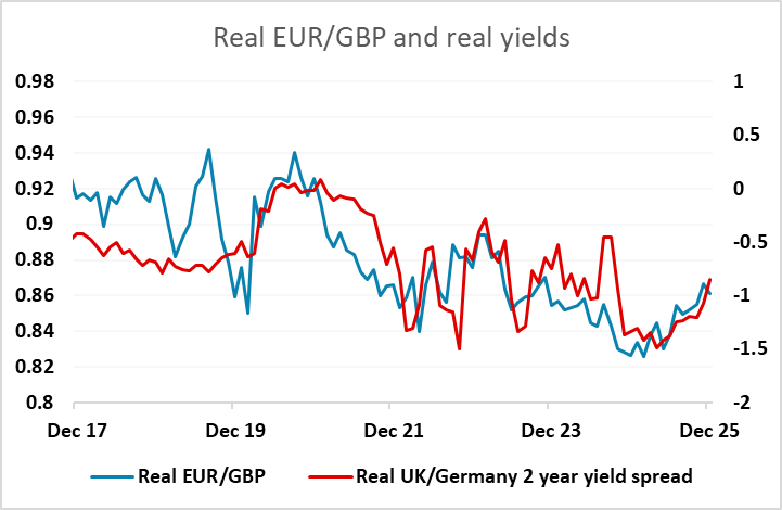 Wednesday sees UK CPI data, following on from the labour market data on Tuesday, which we saw as weak although the market responded as if the data was on the strong side. The official ONS data was mixed, in that there was weakness in private sector wages but the headline numbers were slightly stronger than expected. However, the more up to date HMRC November data on payrolled employment was even weaker, showing wage growth at its weakest since the pandemic. GBP did reverse some initial gains against the EUR and we see scope for more losses.
