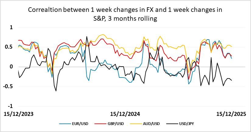 EUR/USD tested above 1.18 on Tuesday but fell back as equities softened after the weaker than expected US PMI data. The European data had also been softer, but the weakness in the US data led to some weakening in equities which generally undermined the riskier currencies. The JPY continues to look the best placed of the majors in these circumstances, with a rate hike still odds on this week and, more importantly, risk sentiment starting to turn a little weaker. The US numbers aren’t particularly bad, but still suggest modest growth and slowing employment growth, which are insufficient to justify the current equity valuations even with AI optimism. Softening equities can be expected to continue to weigh on riskier currencies if we don’t see any significant response in lower US yields.