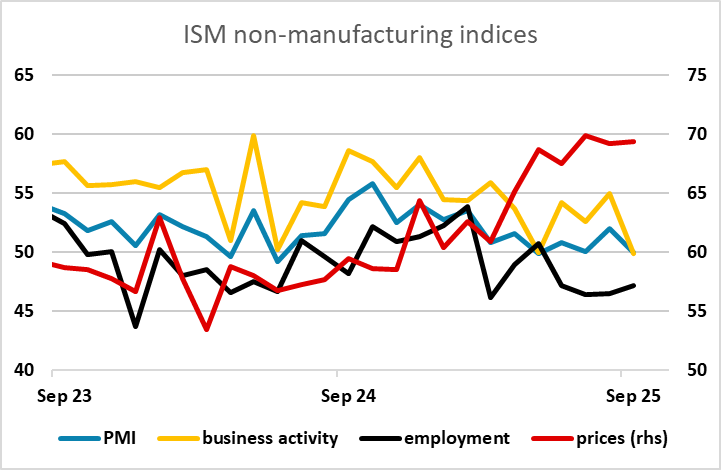 A mixed response to weaker than expected ISM data, with EUR/USD up but USD/JPY also higher. US yields are also up slightly. Objectively, it’s hard to see the data as anything but weaker than expected, although the price index rose slightly, and resilient prices might be a barrier to Fed easing. But if so, weak activity and sticky prices are not particularly good news for the equity market. So the rise in EUR/JPY that has followed the data seems unlikely to persist, and may reflect end of week squaring more than any fundamental news.