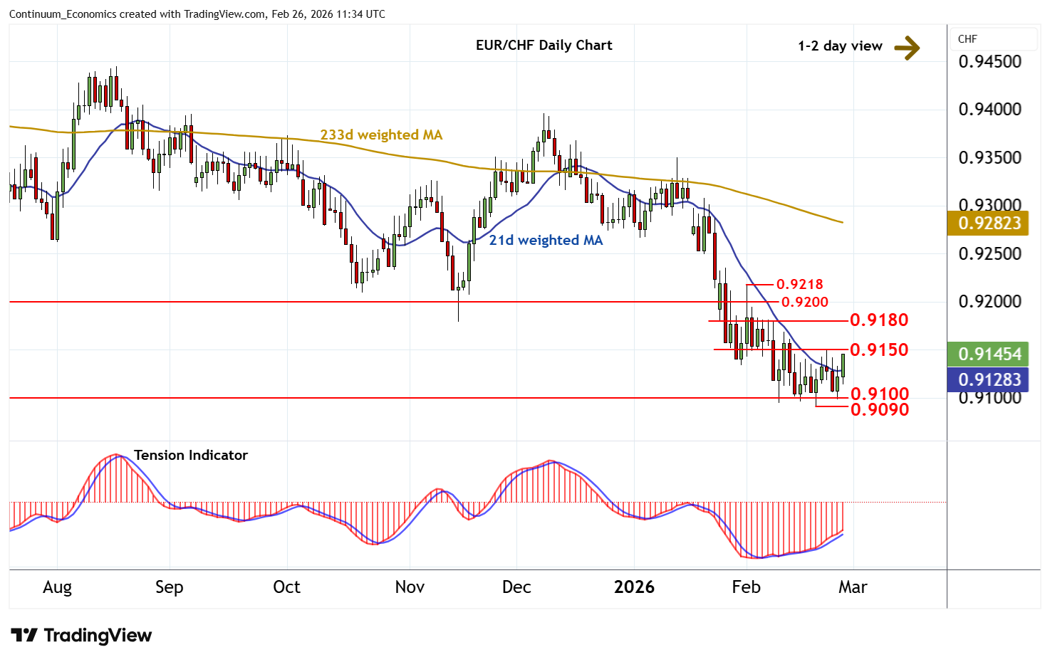 11:15 GMT - Cautious trade is giving way to a push higher in CHF-driven trade, with prices approaching resistance at 0.9150. Rising intraday studies and the positive daily Tension Indicator highlight potential for a test above here. But flat overbought daily stochastics and mixed/negative weekly charts should limit scope in renewed selling interest/consolidation towards congestion resistance at 0.9180. Meanwhile, support is at congestion around 0.9125. But any deeper losses should give way to consolidation above critical support at the 0.9090 current year low of 19 February and congestion around 0.9100.