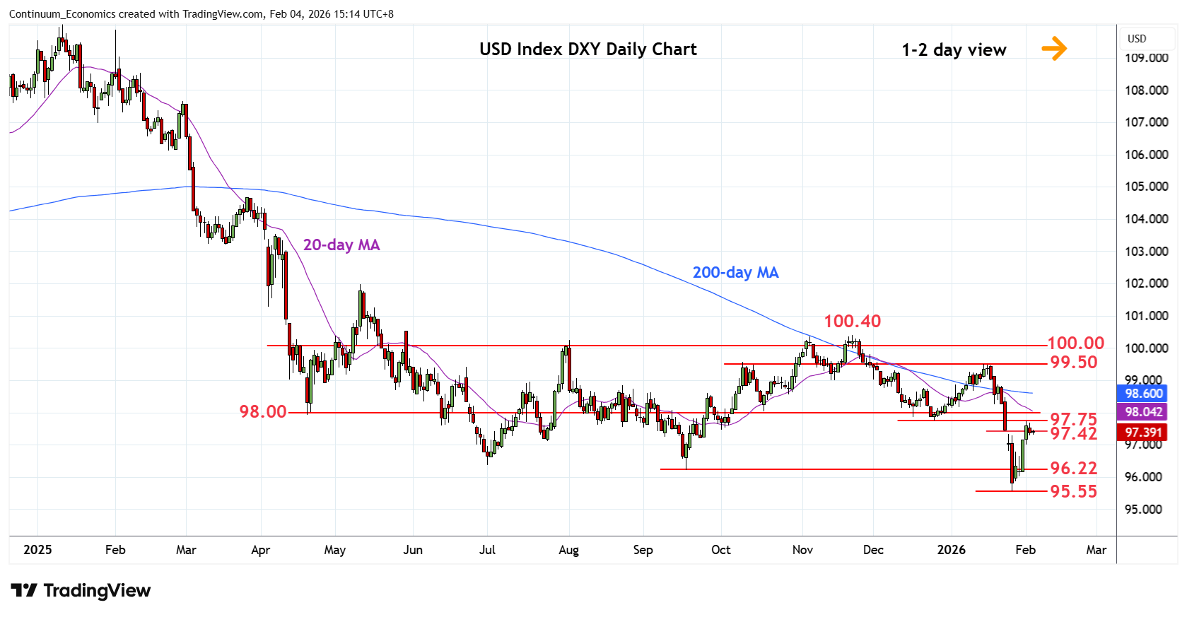 07:20 GMT - Break above resistance at the 97.33/97.42 gap area has seen to reach strong resistance at the 97.75/98.00 area as prices retrace the January losses. This area is expected to cap and give way to renewed selling pressure later with support raised to 97.00 congestion. Would take break here to open up room for retest of support at the 96.50/22 congestion and September low. Below these will return focus to the 95.55 low. Break of the latter will further extend the broader losses from 2022 year high to 95.25, 76.4% Fibonacci level.