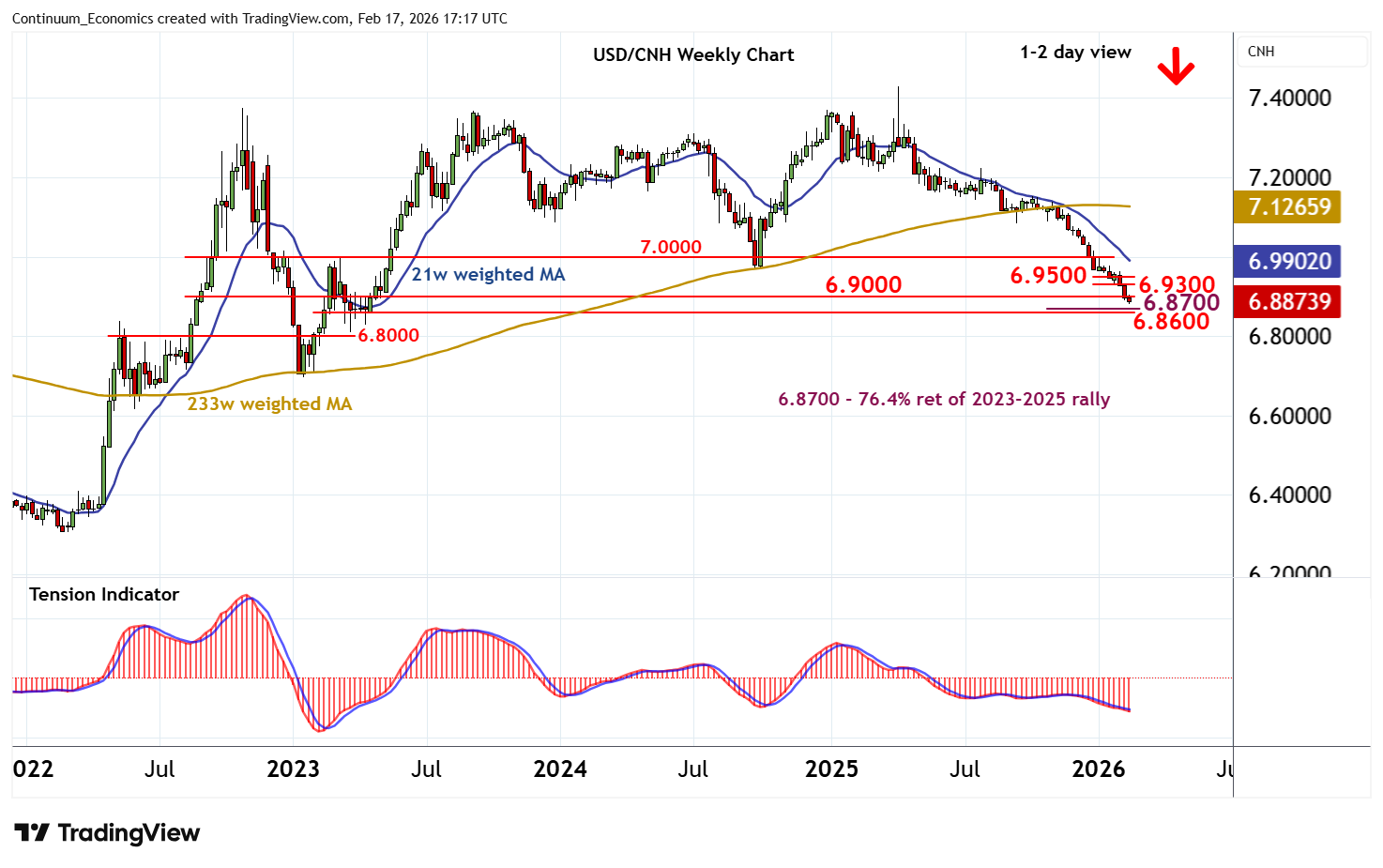 17:30 GMT - Little change, as prices extend cautious trade above the 6.8800 low of 16 February. Oversold daily stochastics are flattening, suggesting room for a minor test higher. But the negative daily Tension Indicator and bearish weekly charts should limit any break in renewed selling interest towards 6.9300. Following cautious/corrective trade, fresh losses are looked for. Support is at the 6.8700 Fibonacci retracement and the 6.8600 historic range lows. A close beneath here will add weight to sentiment and extend April 2025 losses towards the 6.8300 low of April 2023.