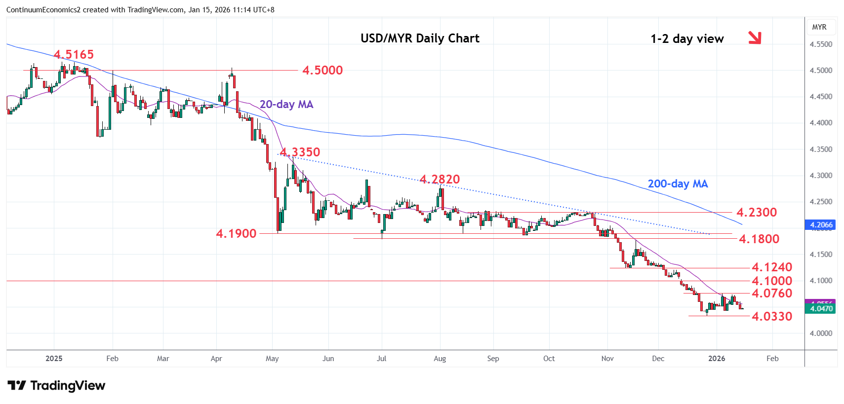 03:40 GMT - Leaning lower following rejection from the 4.0760 bounce high to threaten retest of the 4.0330, December 2025 year low. Break of the latter will open up room for extension to support at 4.0280 low of February 2021. Lower still, will see room to the 4.0000 figure and the January 2021 year low. Meanwhile, resistance at the 4.0760 is expected to cap. Clearance here will open up room for stronger corrective gains to retrace losses from the October swing high to resistance at the 4.1000 level and September 2024 year low.