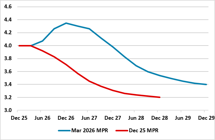 Indeed, this clear warning of hiking is premature to say the least – NB the softening in house prices now emerging is very probably a reaction by households to the reining in of rate cut expectations in recent months, ie prior to the outbreak of the war in Iran, let alone this hiking warning. Moreover, the updated forecasts show an even greater output gap emerging and surely this will have more impact in reining in any inflation surge than one or even two 25 bp hikes. Moreover, we question the extent to which the inflation upgrades are realistic with CPI-ATE now seen averaging 3.3% this year and 2.8% next, some 0.6 ppt and 0.4 ppt higher than envisaged three months ago. Some of the upgrade to this year is due to the apparent fact that CPI data have been higher than expected, but is this an indictment of the Board’s forecasting as despite its assertions to the contrary underlying inflation has been reasonably well behaved.