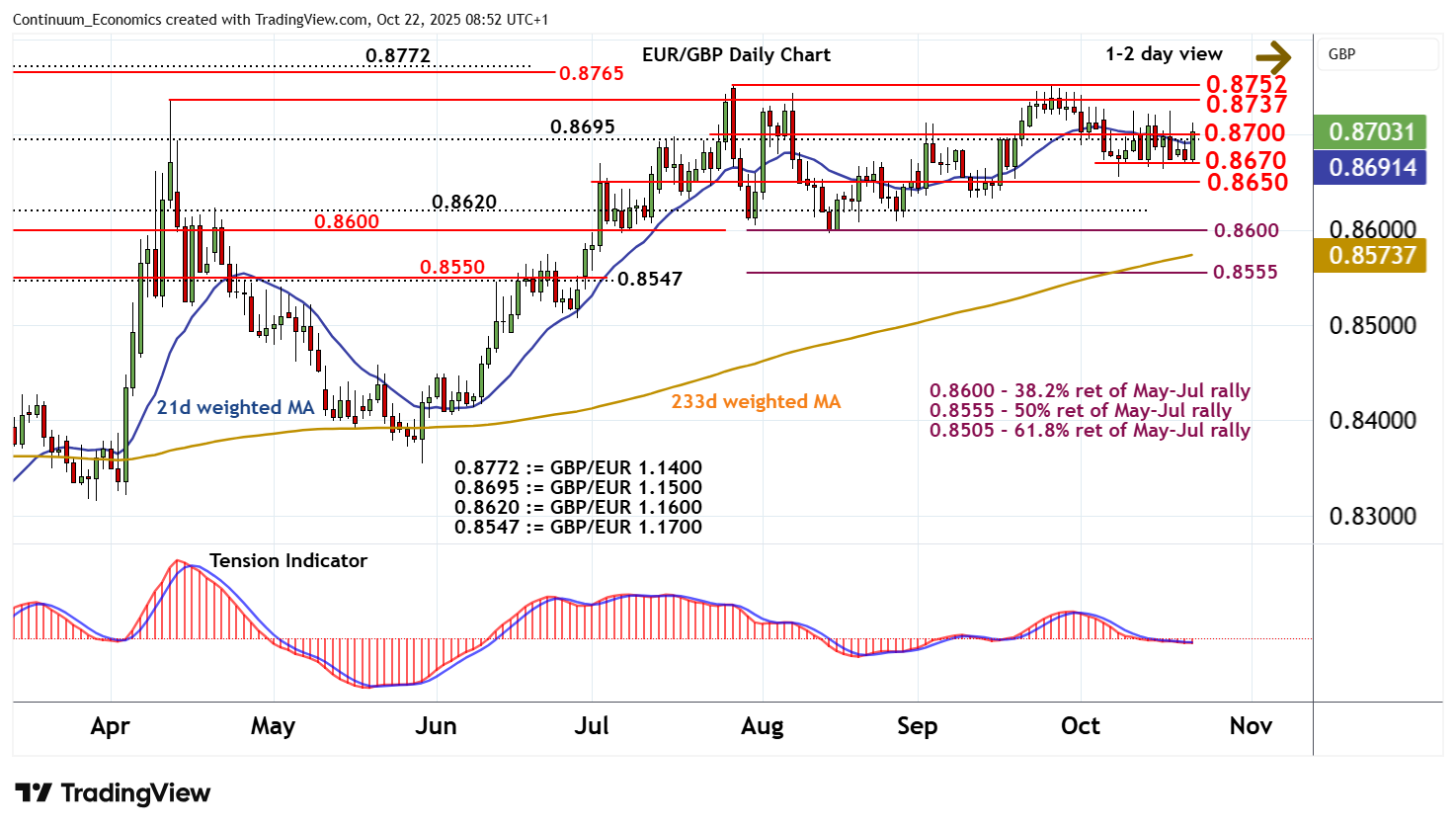UK September CPI has come in weaker than expected at 3.8% y/y, with the core down to 3.5% y/y, both 0.2% below the market consensus. EUR/GBP has risen 30 pips in response, as markets price in the possibility of an earlier cut in UK rates than was previously expected. However, while this data and the labour market data last week have been on the soft side of expectations, they are still unlikely to be weak enough to convince the hawks at the BoE that a November rate cut is justified. A cut is currently priced as around a 35% chance, up from 15% before the data, but a cut is now seen as a 75% chance by year end.
