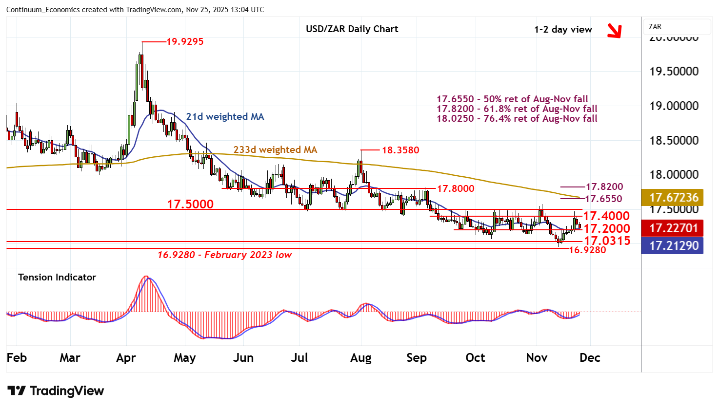12:55 GMT - Cautious trade around 17.2700~ has given way to fresh selling interest, with prices approaching congestion support at 17.2000. Negative intraday studies highlight potential for a test beneath here. But rising daily readings and improving weekly charts should limit any break in renewed buying interest/consolidation above critical support within 16.9280 - 17.0315. Meanwhile, resistance remains at congestion resistance within 17.4000 - 17.5000. A close above here is needed to improve sentiment and extend mid-November gains beyond the 17.5775 weekly high of 5 November towards the 17.6550 Fibonacci retracement.