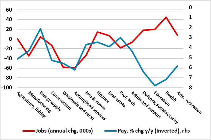 There are still questions about the reliability of official jobs data, making a focus on the now full accredited HMRC payroll data all the more important. This gauge of employment excludes self-employment) and has been showing clear declines of late, albeit some revised away. However, while there signs that payroll weakness has ebbed this is almost solely a result of a further jump in public sector jobs, mainly in health but where fiscal holws suggest that this may go into reverse in the not too distant future. Indeed, public sector payrolls have risen almost full ppt in the last year, but where private sector payroll have not only fallen by the same amount but are falling more steeply (Figure 1). To what extent this reflects the on-going impact of recent tax changes (although the jobs declines are not concentrated in the more wage sensitive service sector) is unclear. But surveys very much suggest companies are at best freezing hiring and at worse laying staff off or not replacing, this latter development helping explain the fact that vacancies have fall in every month for over three years.
