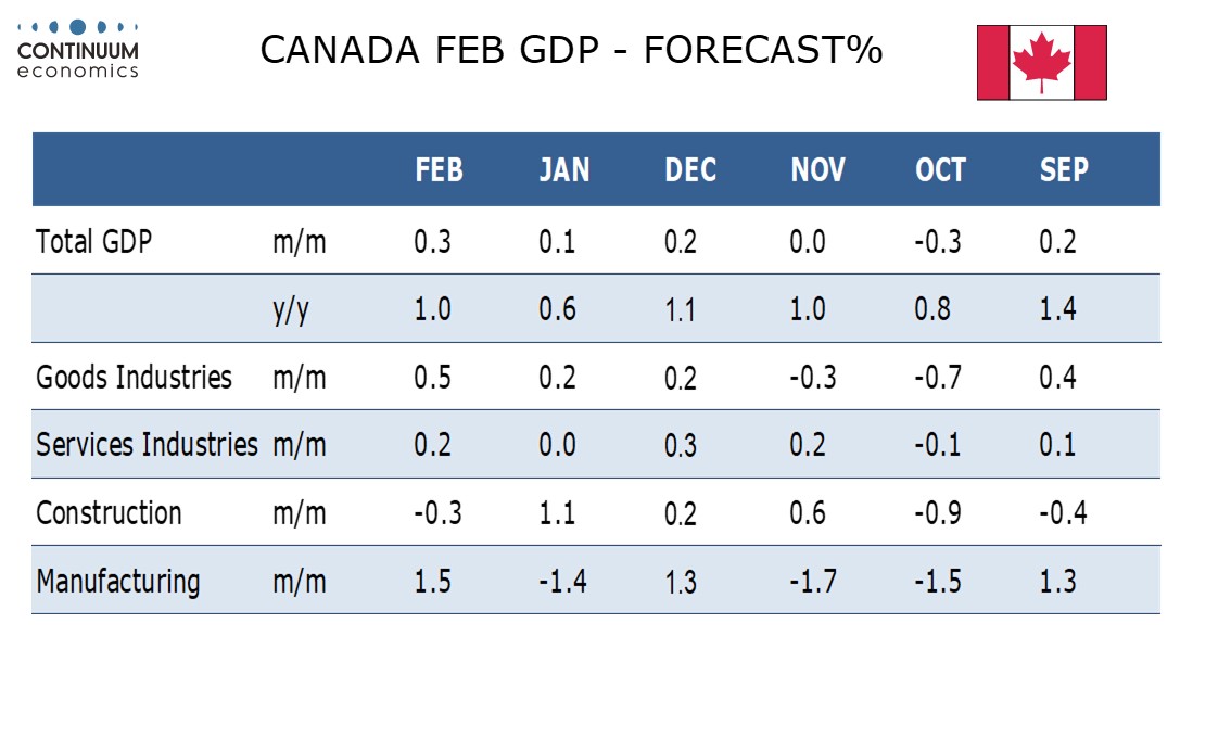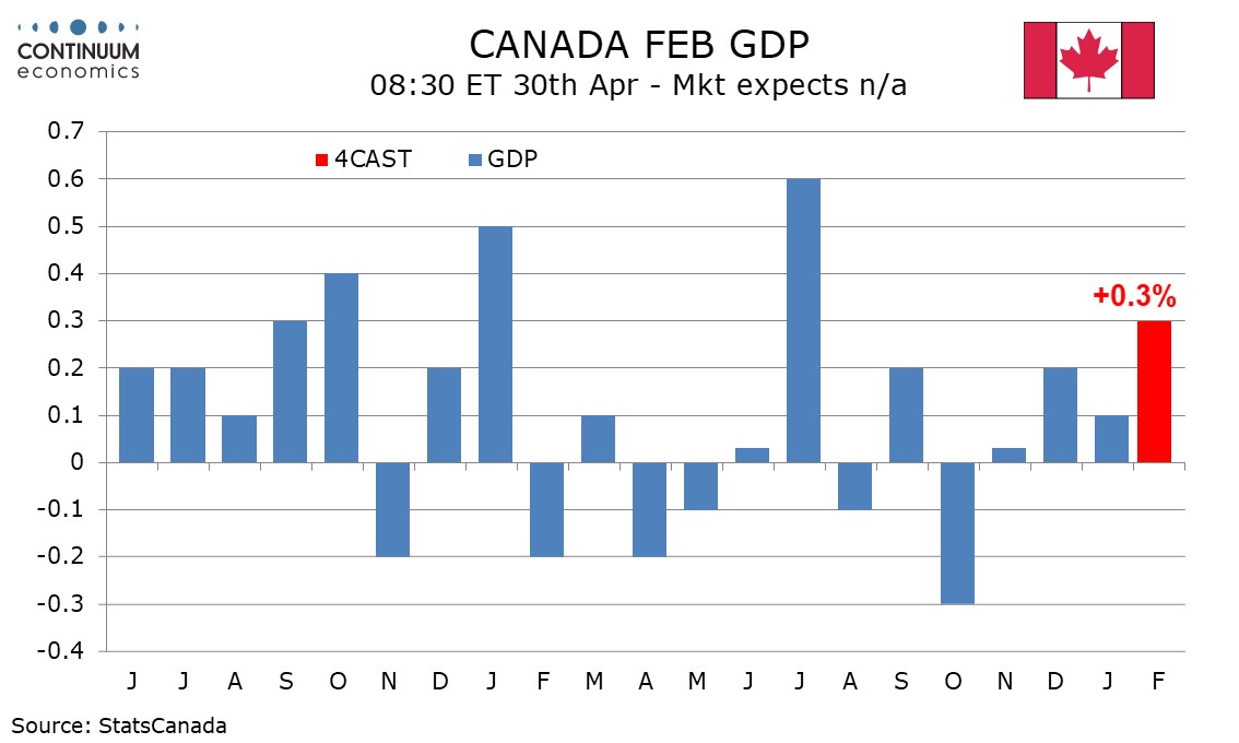 Preview: Due April 30 - Canada February GDP - A stronger month though March may slip