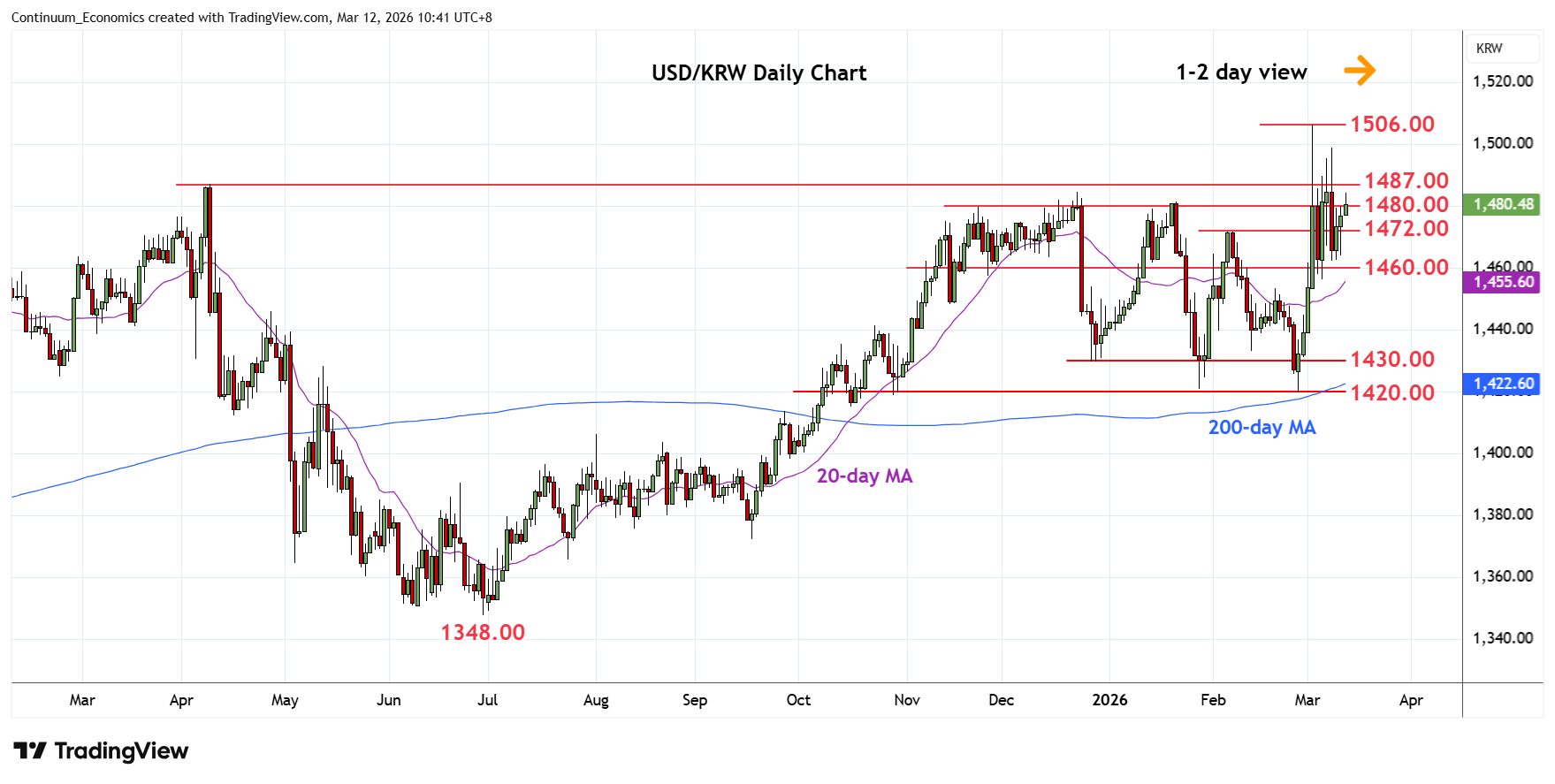 Chart USD/KRW Update: Higher in choppy trade to retest 1480.00/1487.00