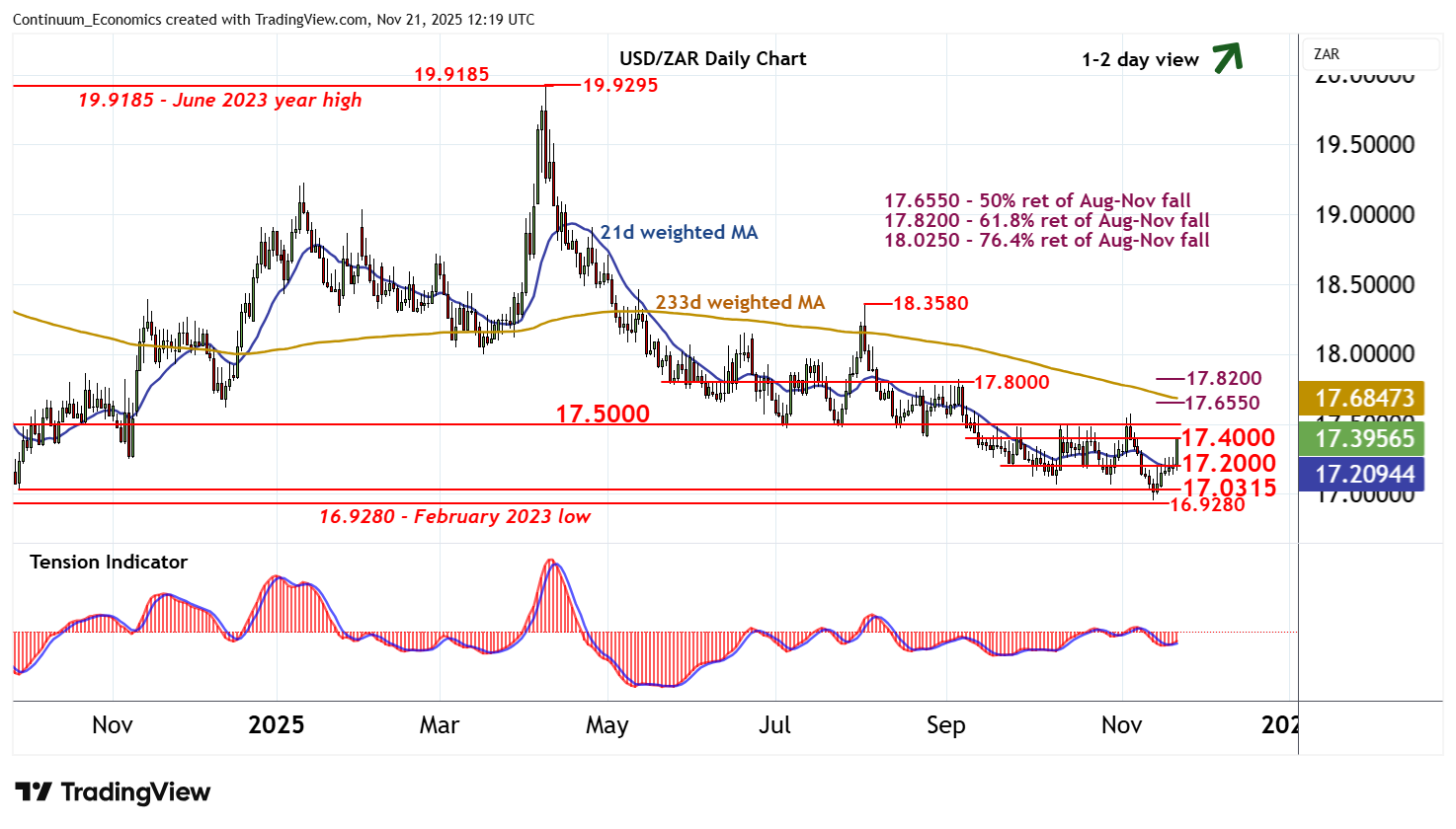 12:05 GMT - Cautious trade around congestion at 17.2000 has given way to the anticipated push higher, with sharp gains currently pressuring congestion resistance at 17.4000. Just higher is further congestion around 17.5000. But already overbought intraday studies could limit any initial tests of this range in consolidation, before rising daily readings and improving weekly charts prompt a break. A close above 17.5000 will improve sentiment and extend mid-November gains beyond the 17.5775 weekly high of 5 November towards the 17.6550 Fibonacci retracement. Meanwhile, support at 17.2000 should underpin any immediate setbacks.
