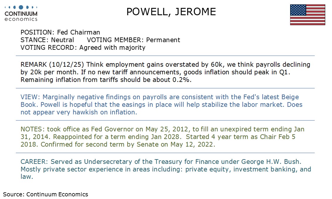 The FOMC has eased by 25bps as expected to a 3.50-3.75% Fed Funds target range, with two hawkish dissents for no change from Schmid (who dissented in October) and Goolsbee, while Miran again dissented for a steeper 50bps ease. The dots are unchanged from September, implying one 25bps ease in both 2026 and 2027 which would take policy to near neutral. The 2025 dots show six favoring no change, implying four non-voters opposed the latest ease. The 2026 dots show seven above the median, eight below and four on the median. The economic forecasts show GDP surprisingly upgraded for each tear from 2025 through 2028, 2026 particularly sharply to 2.3% from 1.8%. PCE price forecasts are revved marginally lower for 2025 and 2026, which may have assisted the decision to ease.