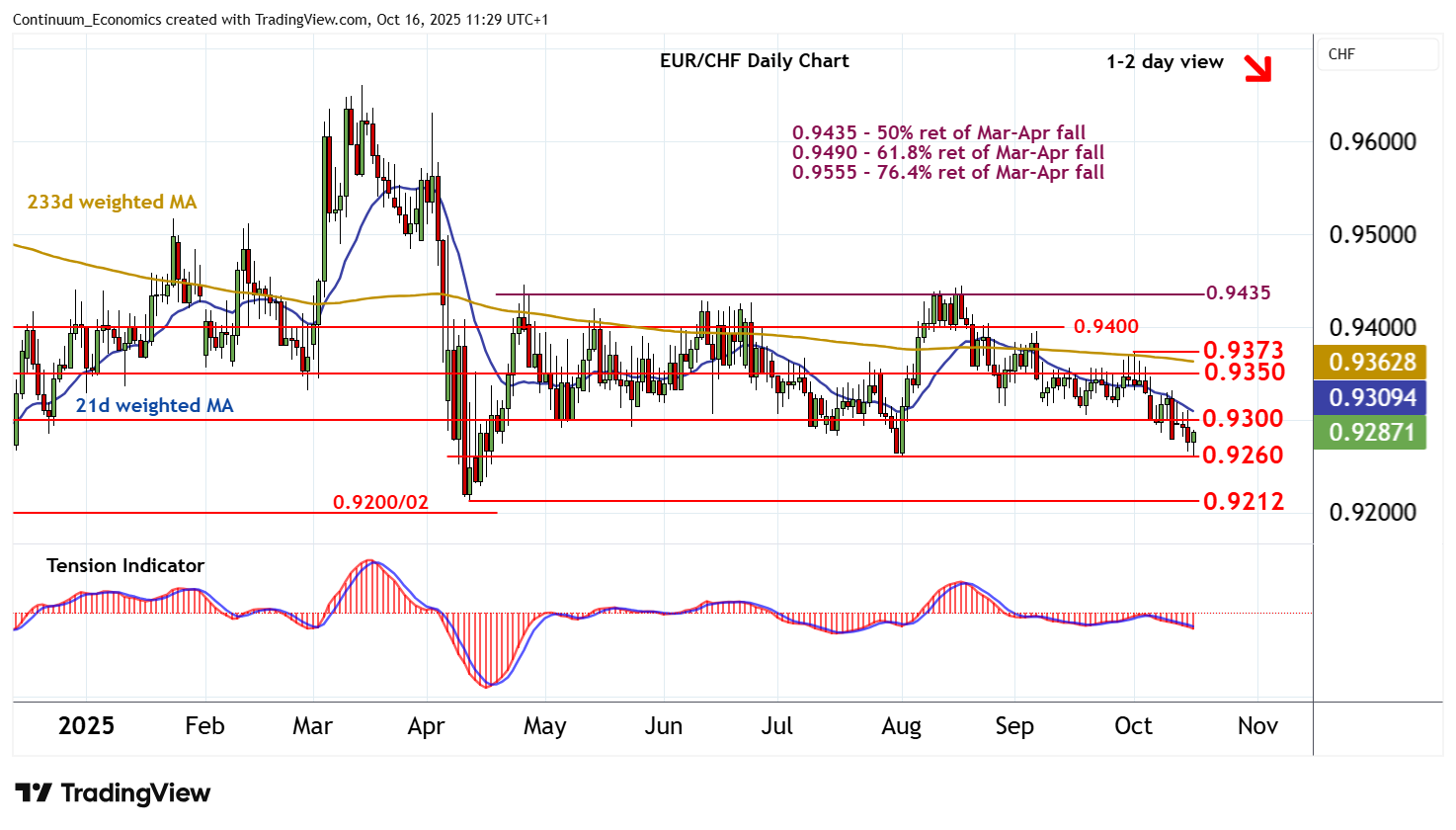 10:55 BST - Anticipated minor tests higher have not been seen, as prices extend losses, breaking below 0.9300 to reach strong support at 0.9260. Unwinding oversold intraday studies are prompting choppy trade above here, but daily readings are under pressure, pointing to room for further losses in the coming sessions. A break will open up critical support within 0.9200/02 - 0.9212. A close beneath here would turn sentiment negative and extend long-term bear trends towards 0.9150. Meanwhile, a close back above 0.9300, if seen, would help to stabilise price action and prompt consolidation beneath further congestion around 0.9350.