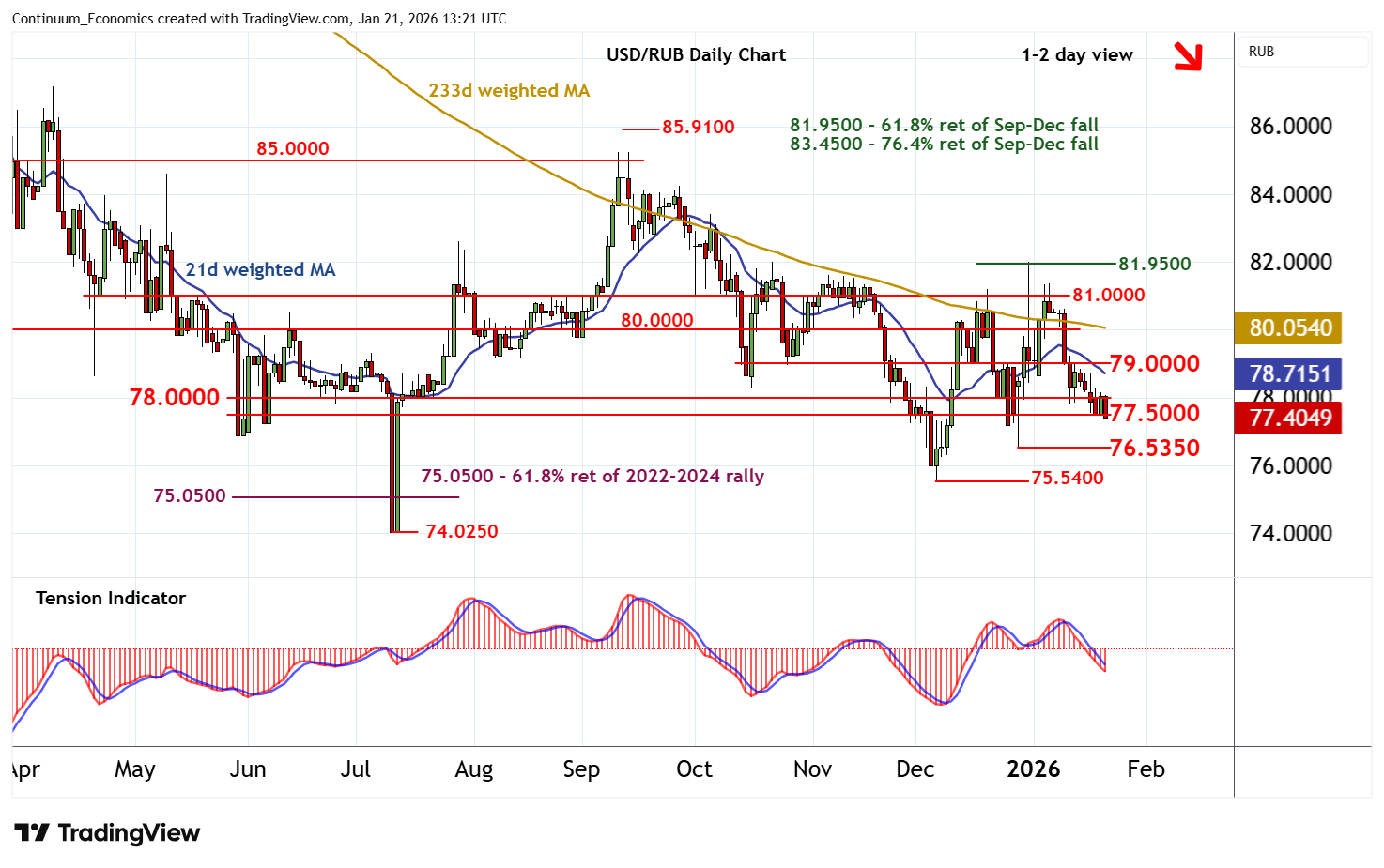 13:05 GMT - Little change, as the test of congestion support at 77.5000 gives way to extended consolidation. Daily readings are under pressure, highlighting room for a break beneath here towards the 76.5350 weekly low of 29 December. Broader weekly charts are also coming under pressure, pointing to room for continuation down to stronger support at the 75.5400 monthly low of 5 December. Meanwhile, resistance is lowered to 78.0000. A close above here, if seen, will help to stabilise price action and prompt consolidation beneath 79.0000.