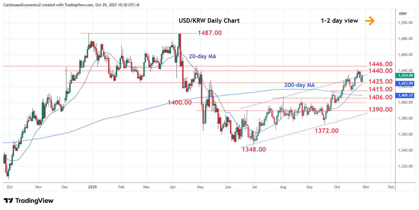 02:40 GMT - Leaning lower in choppy trade from resistance at the 1440.00 congestion as daily studies unwind overbought readings. The weekly studies are overbought as well and threatens deeper pullback to retrace strong gains from the 1372.00, September low. Would take break of support at 1425.00 to open up room to the 1420.00/1415.00, congestion and 16 October low. Below here will turn focus to strong support at 1406.00, August high. Meanwhile, resistance is lowered to 1435.00. Clearance will expose the 1440.00to retest.