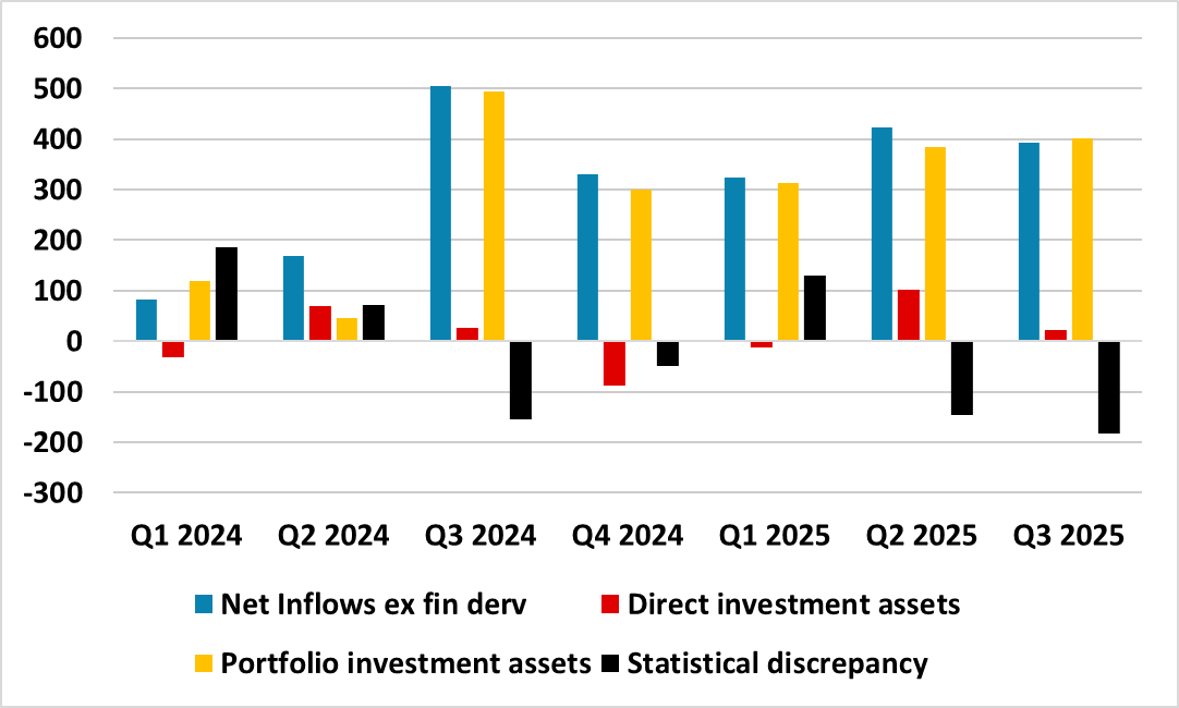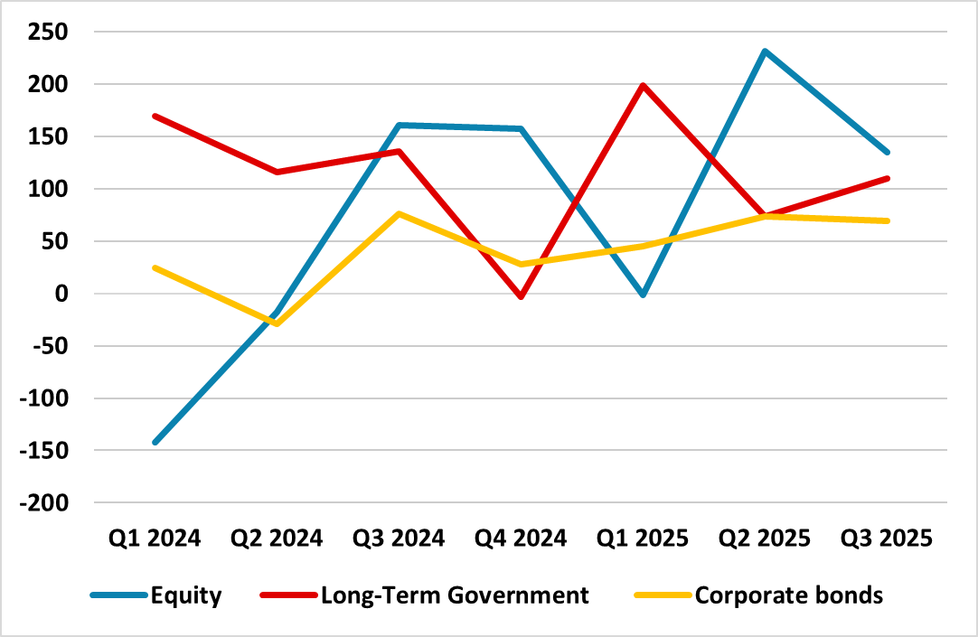 · Portfolio Flows Dominate. Figure 1 shows net inflows are dominated by portfolio inflows (from the quarterly BOP data rather than TICS), with direct and loans/deposits being modest net numbers (statistical discrepancy and seasonal adjustment factors reflects the difficulties of tracking net inflows). Despite all the promises for more direct investment in the U.S., the reality is that new overseas direct investment was only USD89bln in Q3 2025. This will likely pick-up in 2026 as some companies really want to boost U.S. production, but other companies’ investment plans could be a delaying tactic to pacify the Trump administration or due to trade/geopolitical uncertainty. The breakdown shows that the key remains net U.S. equity/long-term U.S. Treasuries and corporate bonds (Figure 2), with some volatility being seen in the 2025 data. U.S. investors accelerated their buying of overseas equities to USD71bln in Q3 2025 in line with anecdotal reports of increased U.S. interest in global equities, but U.S. buying of foreign government and corporate bonds slowed – so outbound net portfolio flows did not really accelerate. Meanwhile, the more important foreign investor buying of U.S. equities averaged USD165bln per quarter (Q4 24-Q3 25), with Q1 2025 seeing a pause before Trump reciprocal tariff announcement before heavy net buying in Q2 and Q3 2025. In the same 4 quarter period average quarterly net foreign buying of Long-dated Treasuries (attracted by 2% real rates) and Corporate bonds averaged USD105bln and USD83bln respectively. Trump erratic policymaking did not really impact foreign investors buying of U.S. assets or U.S. investor portfolio outflows. What will happen in 2026?